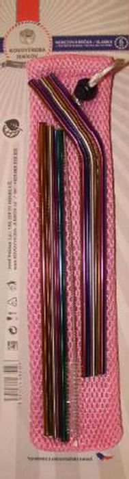 Sada nerezových brček. V sadě se nacházejí 2 rovná + 2 zahnutá nerezová – DUHOVÁ, 1 rovné a 1 zahnuté nerezové STŘÍBRNÉ brčko, čistítko a RŮŽOVÝ sáček pro jejich pohodlné uskladnění.