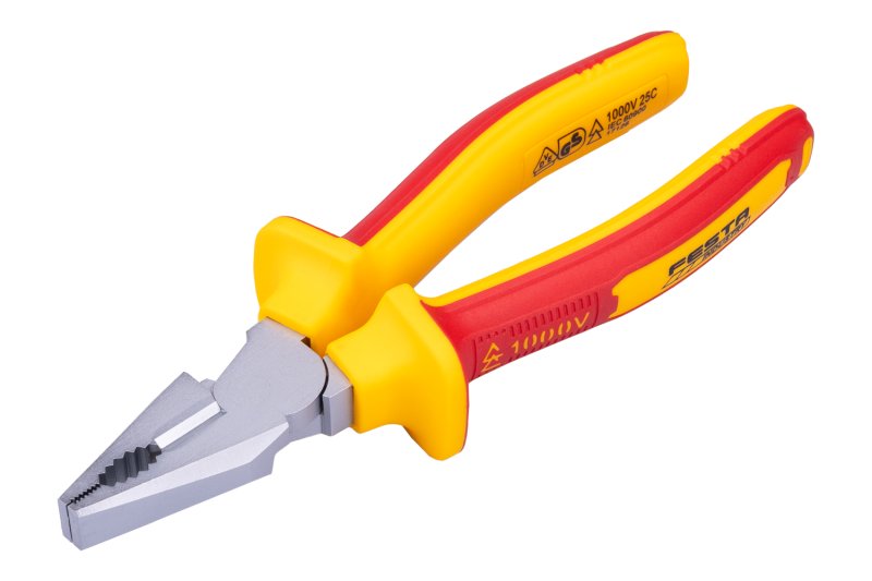 Kleště VDE kombinované 180 mm FESTA mají certifikaci elektro VDE 1000 V, IEC/EN 60900-2004, kombinace polypropylenu a pryže na ergonomicky tvarovaných ručkách zaručuje výborné antiskluzové vlastnosti a dobrou odolnost vůči mazadlům a chemikáliím. Uchopovací čelisti obzvláště odolné proti opotřebení, chromvanadová vysoce výkonná ocel. Hmotnost 0,333 kg.