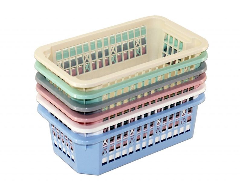 Košík stohovatelný, při otočení o 180° je možno stohovat, dalším otočením o 180° košíky zapadnou do sebe, mix barev, plast