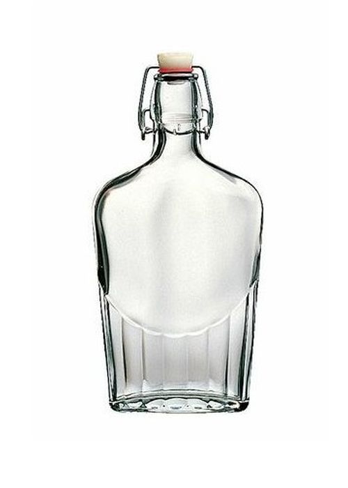 CZ láhev 0,5l placatka FIASCHETTA. Láhev s patentním uzávěrem z transparentního skla pro uchování především alkoholických nápojů. Objem 0,5l, rozměry: šířka 11,5cm, hloubka 4cm, výška 24cm. Vhodná do myčky nádobí.