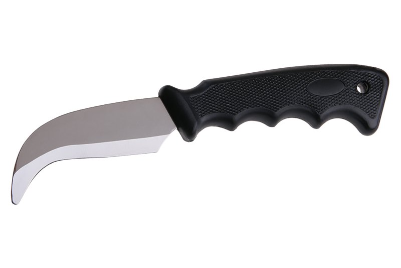 Nůž se zahnutým ostřím, určeno na řezání podlahových a střešních krytin, izolací atd, ostří zalončeno zaoblenou tupou špičkou, plastová ergonomická rukojeť, blistr.