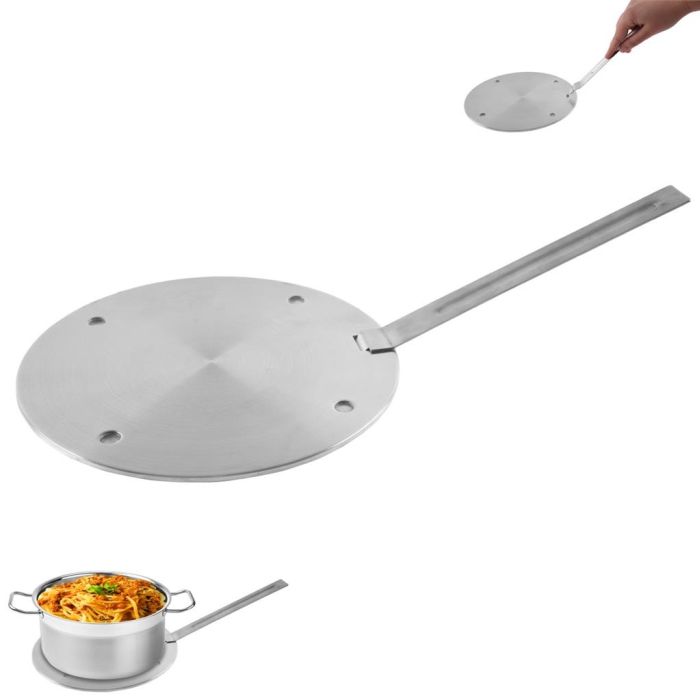 Indukční podložka o pr. 20 cm s odnímatelnou rukojetí, vyrobená z nerezavějící oceli a opatřená hliníkovou akumulační vložkou. Podložka má odnímatelné držadlo. Není vhodná do myčky. Rozměry: v. 0,3cm x pr. 20cm.