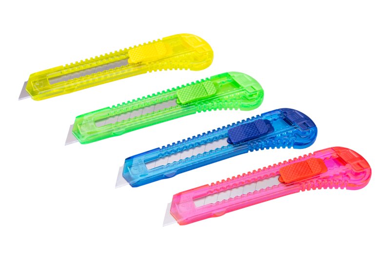 Sada plastových odlamovacích nožů 18mm, 12ksů, plastová kruhová dóza, barevný mix.
