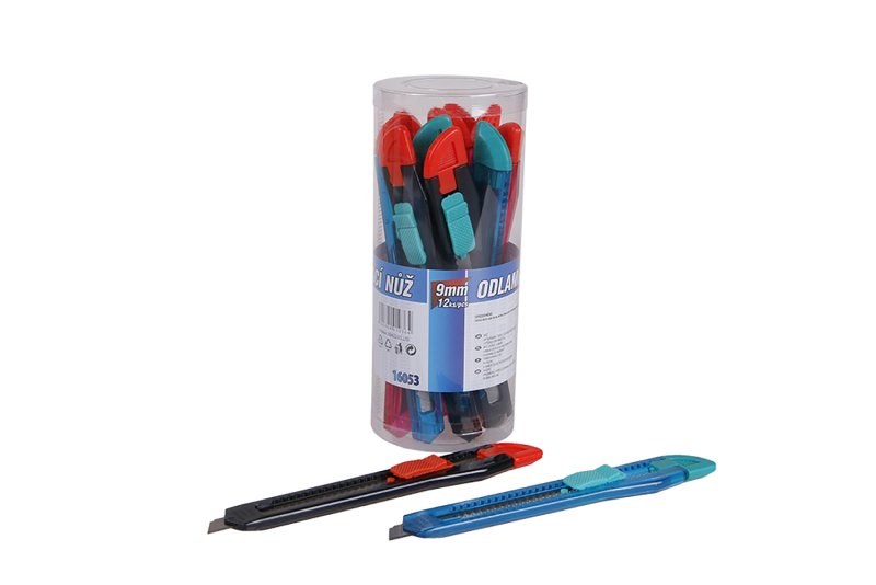 Sada plastových odlamovacích nožů 9mm, 12ksů, plastová kruhová dóza, barevný mix.