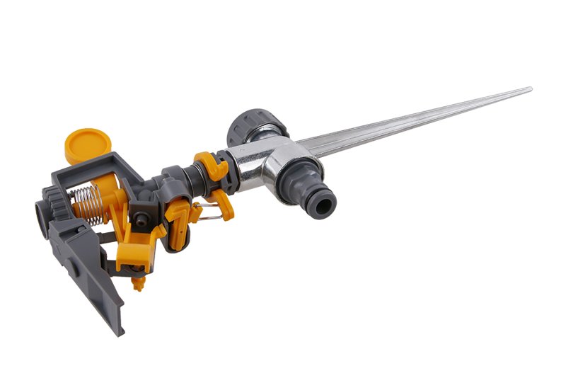 Hrotový dvoucestný impulzní zavlažovač s přípojením hadicovou rychlospojkou, plast/kov. Min.70 kPa a max.550 kPa.
