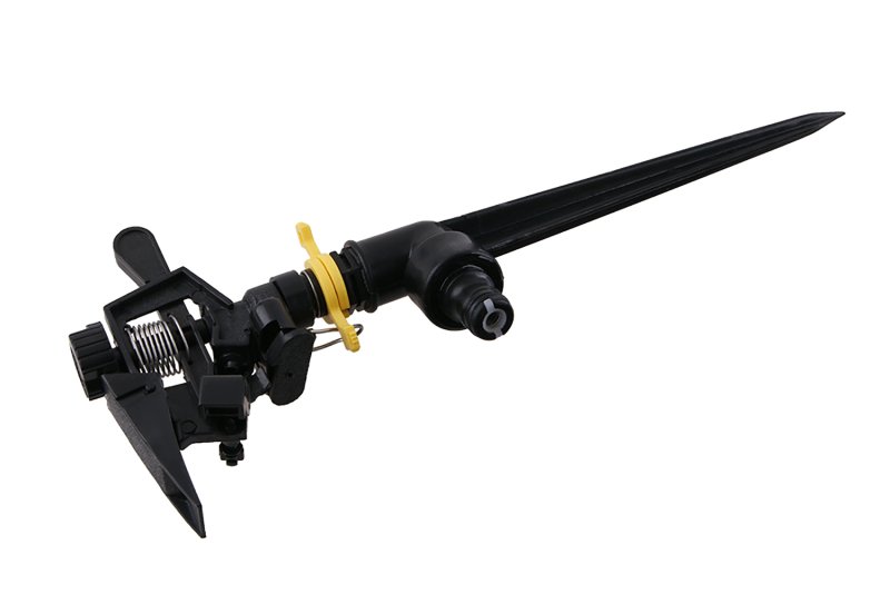 Impulzní jednocestný hrotový zavlažovač s přípojením hadicovou rychlospojkou, min.70 kPa a max.550 kPa.