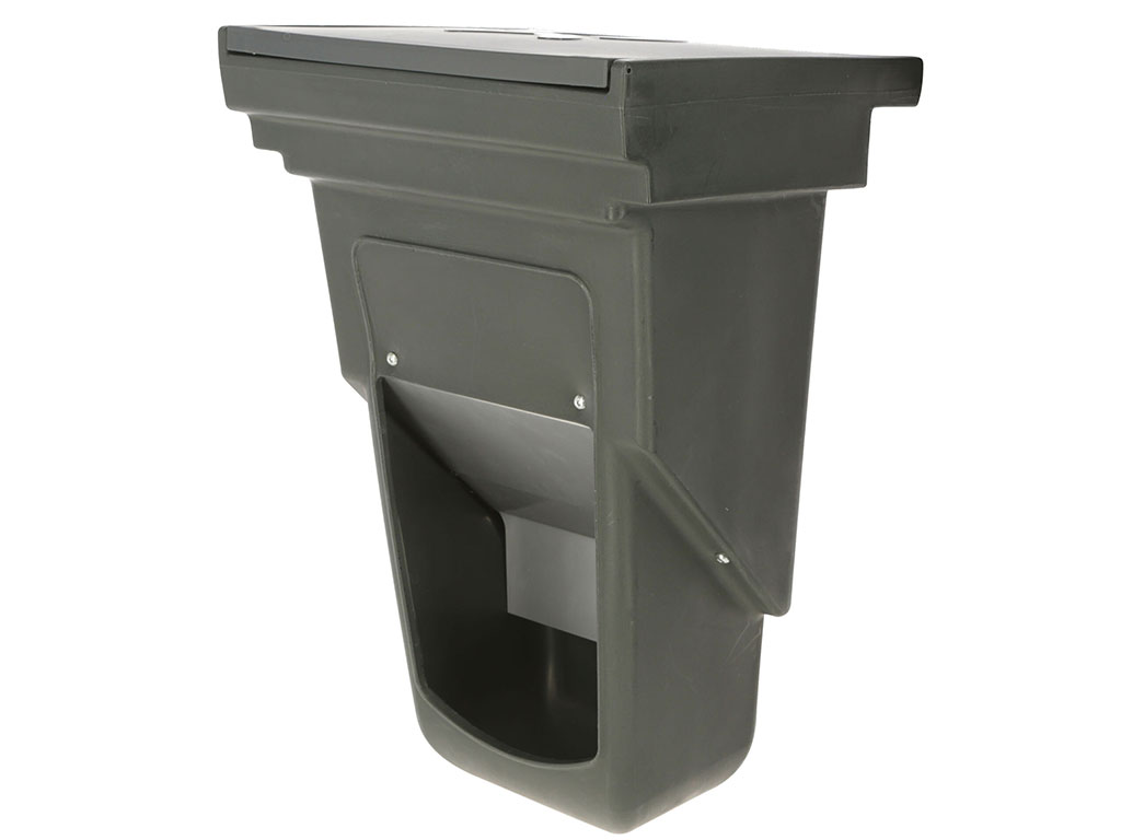 Automatické krmítko pro telata, na koncentrovaná krmiva, instalace na vnitřní stranu plotu, snadné plnění z vnější strany, ochrana krmiva před deštěm, z pevného plastu, objem 13 litrů, rozměry 33x51,2x27 cm.