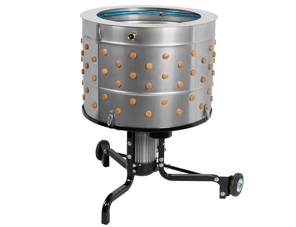 Nerezová bubnová škubačka drůbeže, na slepice, husy, kachny, krůty, kapacita pro 2 kusy drůbeže, max 10 kg, oplachovací kruh pro smývání oškubaného peří, bezúdržbový motor s výkonem 1300W, rychlost 300 ot./min, 158 ks škubacích prstů, jednoduché a rychlé čištění, gumové kola s kuličkovými ložisky, výška bubnu 480mm x Ø bubnu 650mm, Ø otvoru bubnu 500mm, rozměry škubačky: 780x726x904mm.