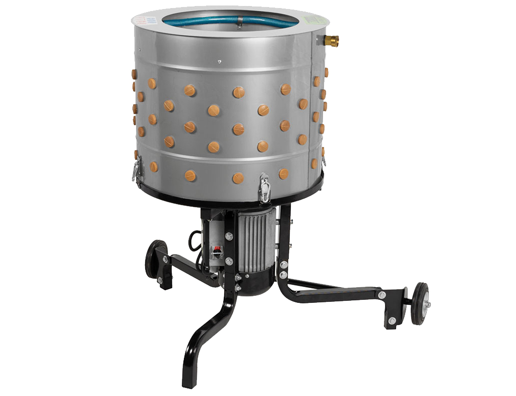 Nerezová bubnová škubačka drůbeže, kapacita pro 2 kusy slepic, max 6 kg, oplachovací kruh pro smývání peří, bezúdržbový motor s výkonem 1000W, rychlost 300 ot./min, 111 ks škubacích prstů, jednoduché a rychlé čištění, gumové kola s kuličkovými ložisky, výška bubnu 420mm x Ø bubnu 500mm Ø otvoru bubnu 350mm, rozměry škubačky: 780x680x915mm.