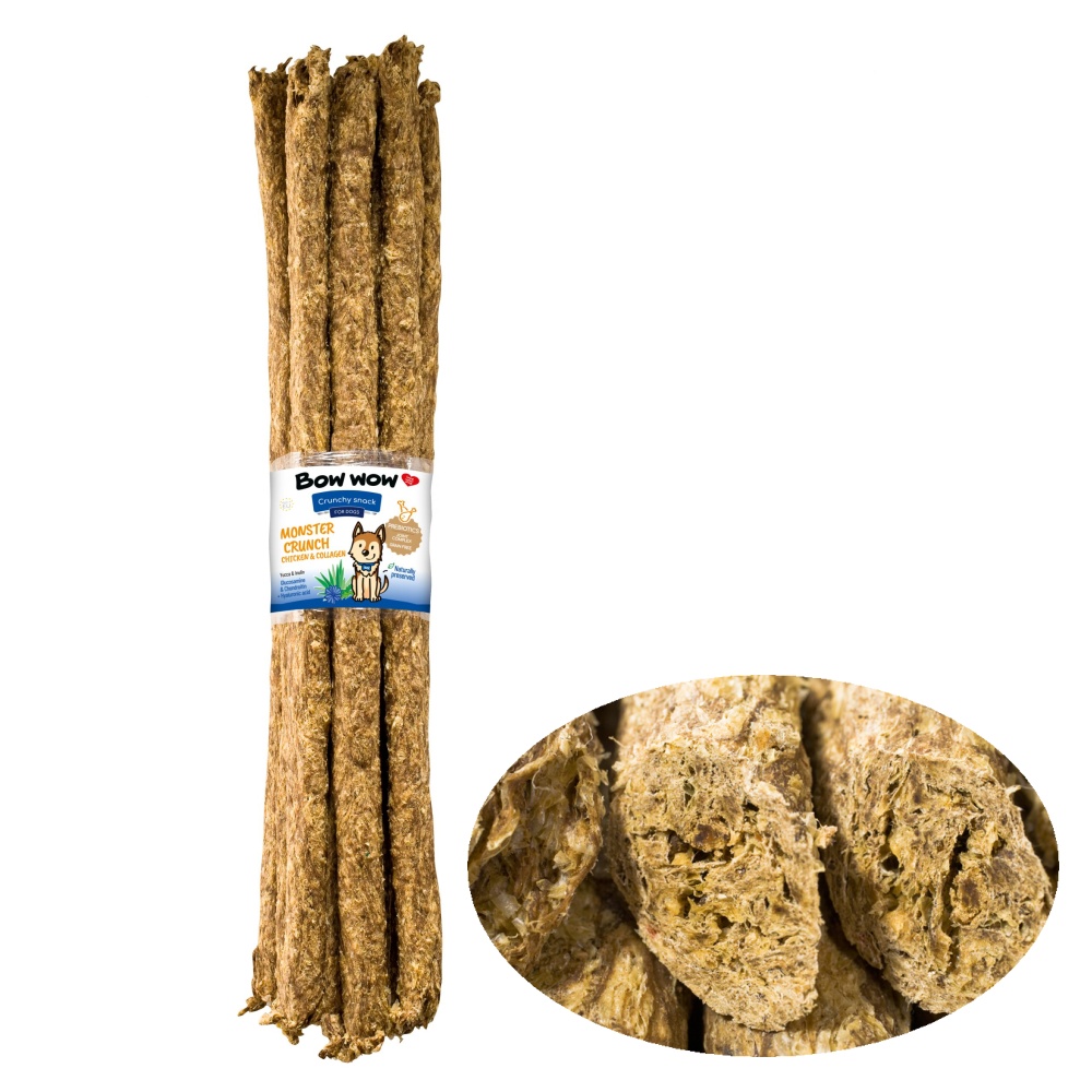 Cca 58 cm dlouhá pochoutka s glukosaminem a chondroitinem se dá snadno lámat na jakkoliv velké díly. Bez umělých barviv.