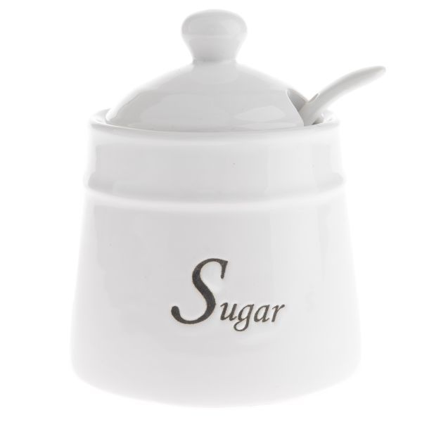 Cukřenka 0,53l, d11x14cm, SUGAR, lžička, bílá keramika