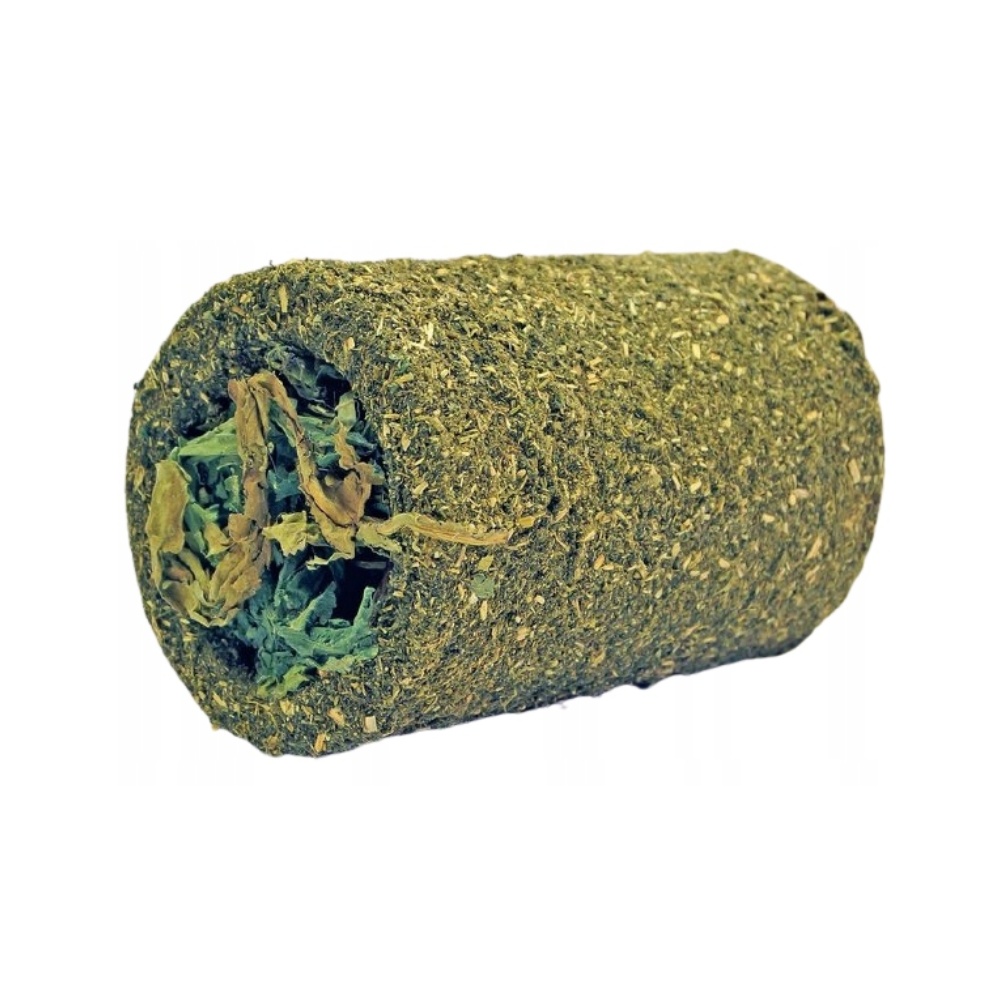 Vojtěšková pochoutka pro hlodavce ve tvaru plněného tunelu na roli s bylinkami a semínky.