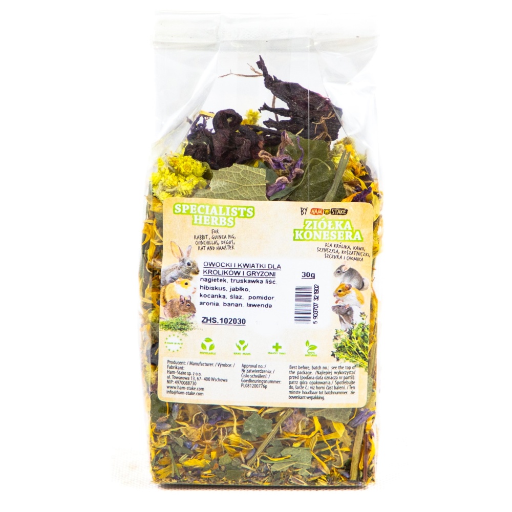 Ovoce a květiny pro hlodavce a králíky jsoou skutečným festivalem chutí, vůní, vitamínů a nutričních hodnot. Vyvážená kombinace květin, jako je měsíček, ibišek, sléz a slaměnka, společně s ovocem, jako je jablko, banán, růže nebo rajče. Složení, které nabízí širokou škálu zdravotních výhod. Při pravidelném podávání zlepší stav vašeho mazlíčka.