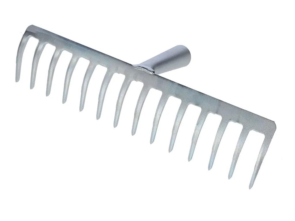 Kovové hrábě, provšestranné použití, z pískované a pozinkované oceli, 14 hrotů, bez násady, průměr pouzdra na násadu 28 – 28,5 mm, šířka 36 cm.