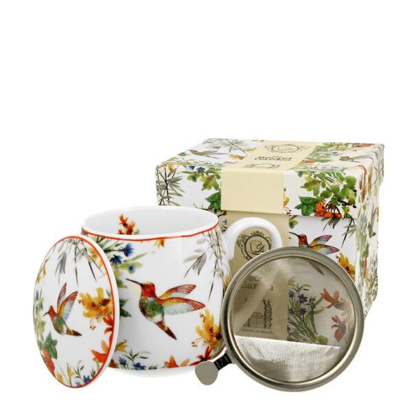 - Hrnek 430ml baňatý LINNEA kolibřík+víčko+sítko NR, porcelán, DB