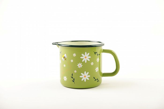 Smaltový hrnek s výlevkou s dekorem drobných kvítků a včeliček. Uvnitř je nazelenalý smalt, který ladí s vnějším smaltem.