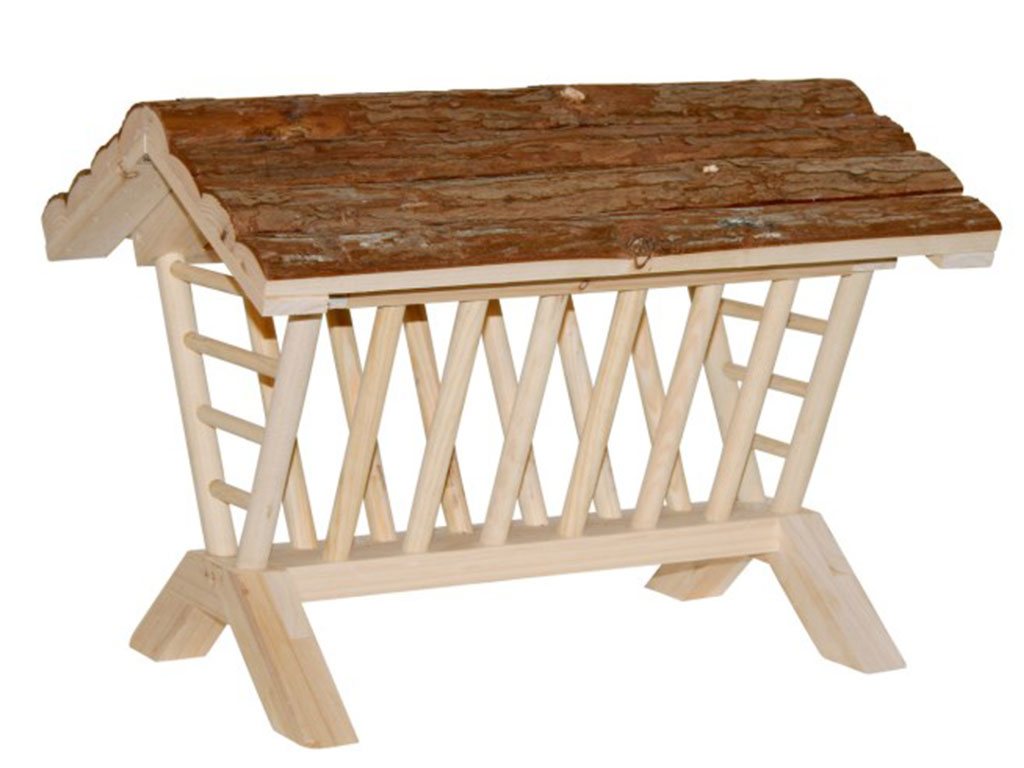 Jesle na seno ve tvaru krmelce z přírodního dřeva, s ochrannou stříškou, o rozměrech 45x32x33 cm.