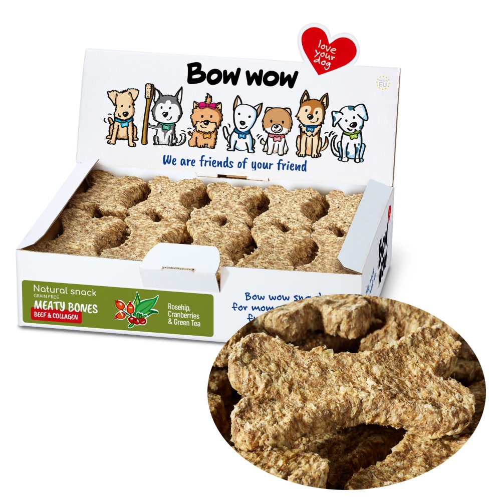 Naturální pochoutka pro psy ve tvaru kosti s hovězím, kolagenem, šípkem a brusinkou.