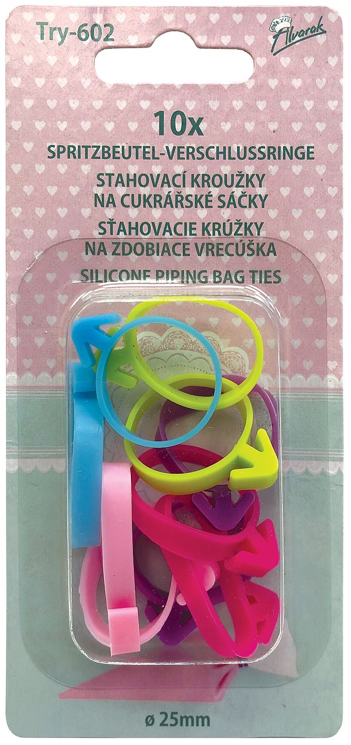 Stahovacími kroužky na zdobicí sáček se zabrání vytékání krému ze sáčku a díky tomu se udrží sáček v čistotě. Kroužky jsou vyrobeny z kvalitního plastu a jsou snadno omyvatelné. Balení obsahuje 10 ks.