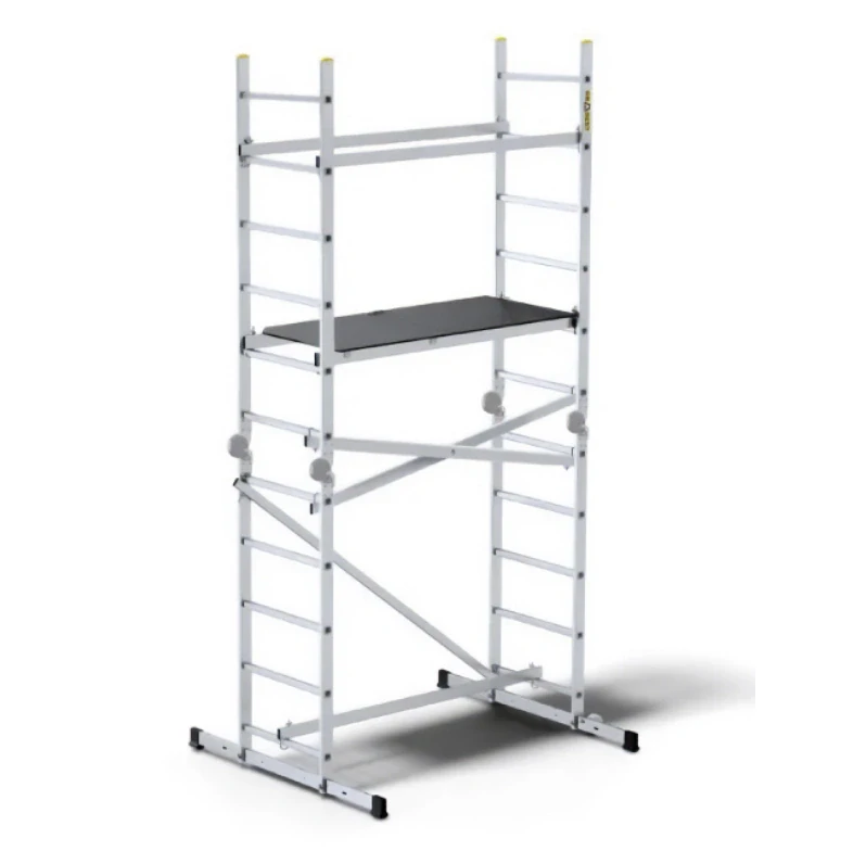 Maximální odolnost a variabilita 3v1 Základem je lehká, ale vysoce odolná hliníková konstrukce, která umožňuje snadnou manipulaci i přepravu. Unikátní kloubový systém dovoluje lešení bleskově proměnit v pracovní plošinu nebo vysoký žebřík, čímž se přizpůsobí jakémukoliv terénu. S nosností 150 kg se nemusíte bát vzít si s sebou na plošinu i těžší nářadí nebo materiál.