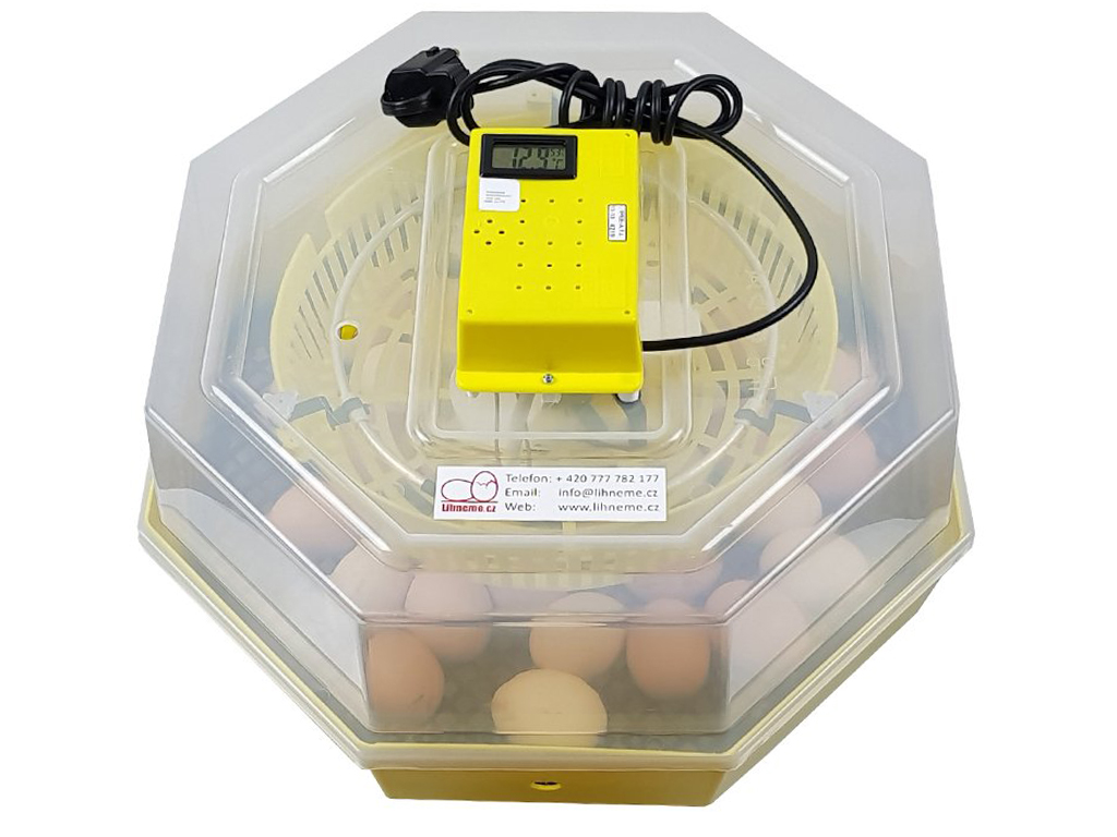 Líheň na vejce vhodná k líhnutí vodní a hrabavé drůbeže - pro kuřata, křepelky, kachny, krůty, husy a bažanty. S manuálním (ručním) otáčením až 60ks slepičích vajec - možnost přikoupit otočný rošt, s regulací teploty od 35 do 40°C, s manuální regulací vlhkosti, s teploměrem a s vlhkoměrem.