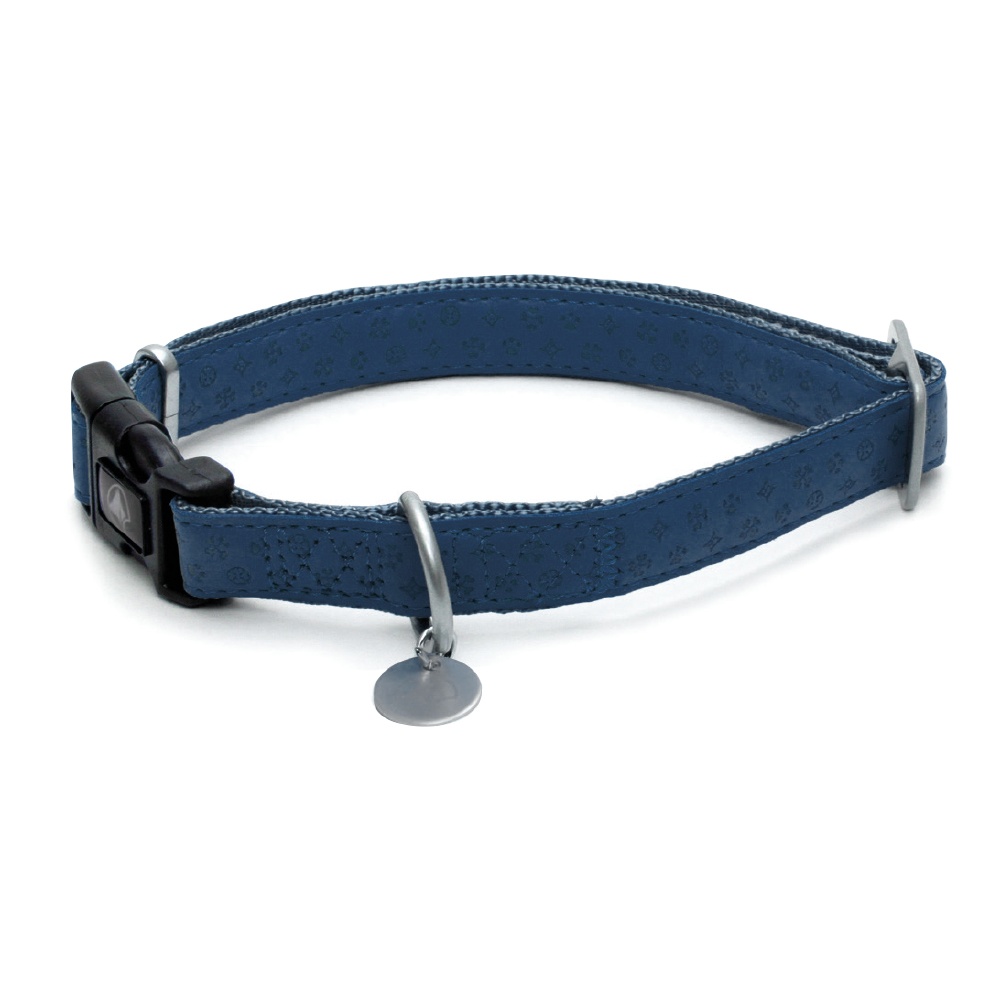 Kožený obojek modré barvy s celopotiskem, podšitý jemným nylonem ve stejné barvě.