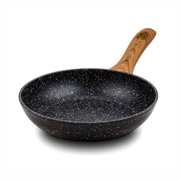 Pánev s granitovým povrchem. Vyrobeno z litého hliníku a ocelové indukční vložky. Pánev je v černé barvě. Má rukojeť vyrobenou z plastu imitujícího dřevo.