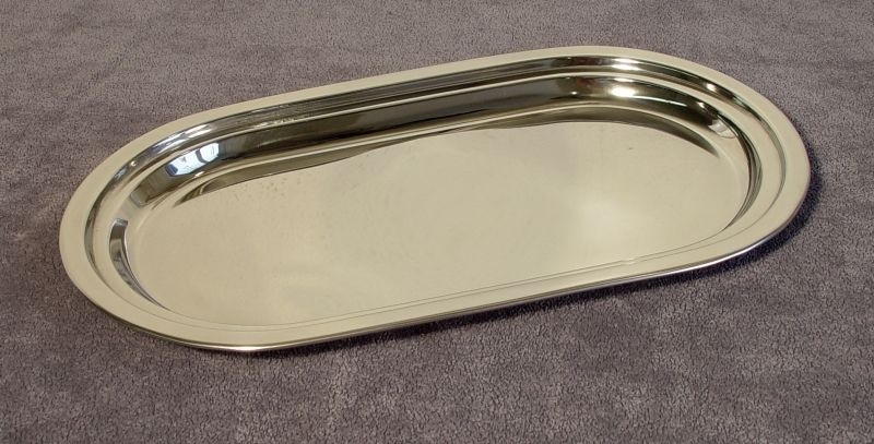 Tác využijete na servírování chlebíčků, zákusků, ... Materiál: nerez. Oválný tvar. Rozměry: 33x19 cm.