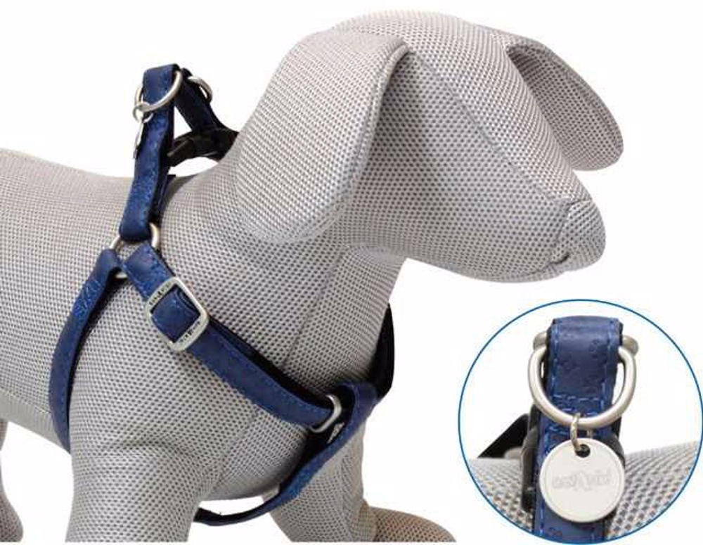 Kožený postroj modré barvy s celopotiskem, podšitý jemným nylonem ve stejné barvě.