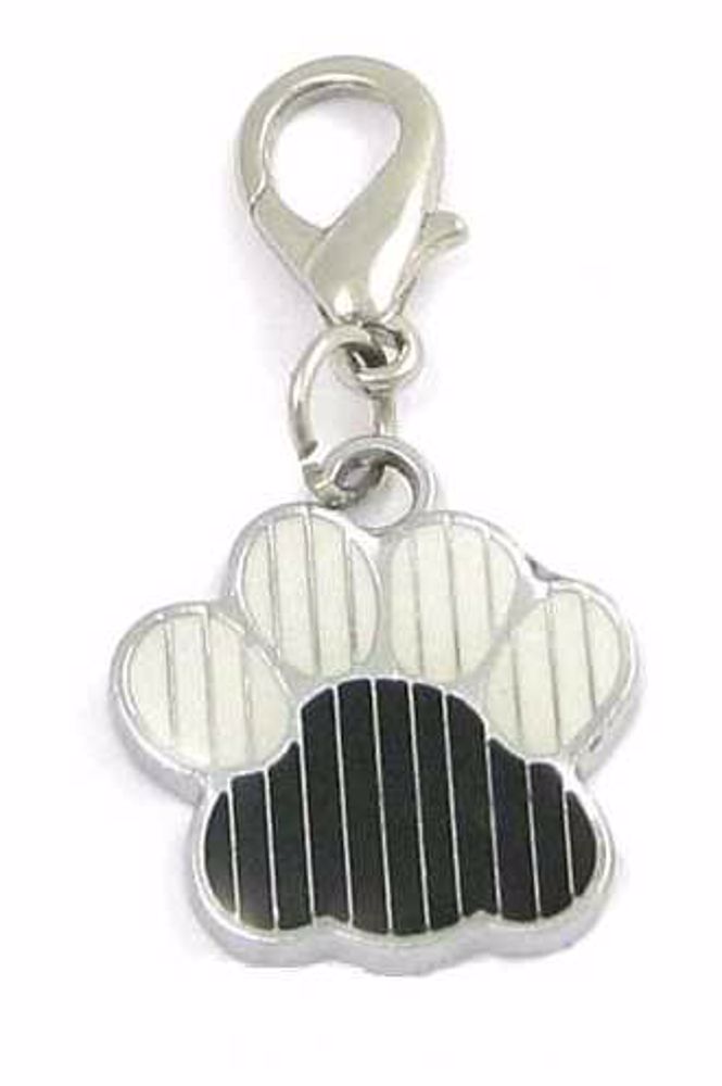 Přívěšek na obojek ve tvaru černobílé tlapky.