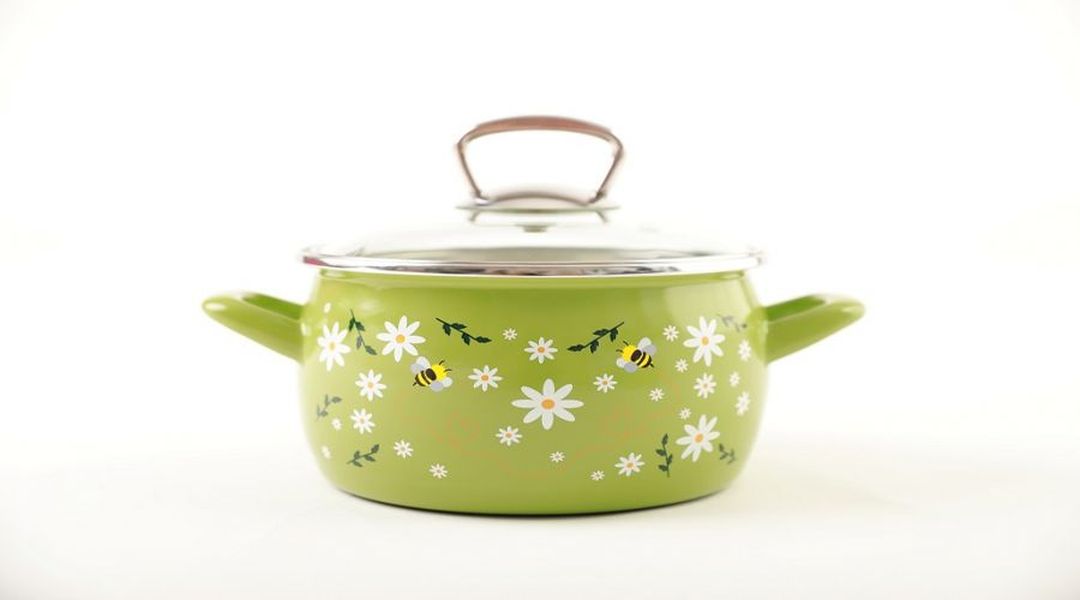 Smaltový rendlík s dekorem drobných kvítků a včeliček. Uvnitř nádoby je nazelenalý smalt, který ladí s vnějším smaltem. Rendlík je opatřen poklicí s nerezovým úchytem. Může být tedy použit i v troubě.
