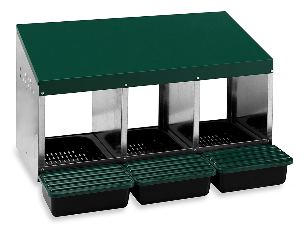 Snáškové hnízdo pro slepice se sběrným košíkem na vejce trojmístné, kapacita až 15 nosnic (5 nosnic na jednu kukaň), dno hnízda je spádované, vejce se samo odkutálí do sběrného košíku, vyrobené z pozinkovaného kovu s plastovým dnem, barva zelená. Hnízdo můžete jednoduše postavit v kurníku na zem nebo zavěsit na zeď, velice snadná údržba čistoty, rozměry: 48 cm délka x 79,7 cm šířka x 52 cm výška.