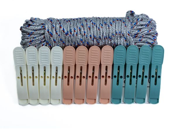 šňůra 13m+kolíčky 12ks (8,5*1,8*3,8cm), 3barvy, kov.pružina, plast