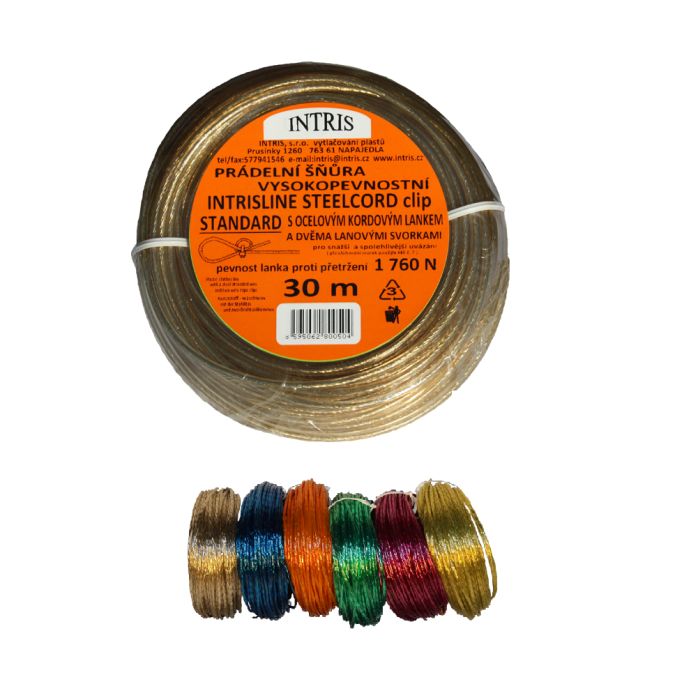 Značková vysokopevnostní prádelní šňůra s novým, ještě pevnějším ocelovým lankem kordového typu. HT kvalita použitých drátů, krátké stoupání závinu lanka a silné zatažení drátů dává tomuto typu šňůry nově nejen neuvěřitelně vysokou pevnost proti přetržení 1 990 N (199 kg), ale také zabraňuje riziku vzlínání vlhkosti vnitřkem lanka, což dává tomuto typu šňůry dlouhou životnost. Tuhost tohoto kvalitního lanka může uvazování šňůry činit obtížným. Proto prádelní šňůry v provedení CLIP jsou doplněny u každé jednotlivé šňůry dvěma pozinkovanými ocelovými lanovými svorkami pro snadnější a spohlivější uvázání. A proč dvě svorky ? Každá šňůra má totiž konce dva. K zatažení matek na svorkách je nejlépe použít klíč č. 7.