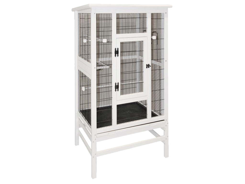 Voliéra pro ptáky z masivu, lakované smrkové dřevo, plastový výsuvný trusník, kulaté černé mříže, bitumenová střecha, 3 uzamykatelná dvířka, 4 bidýlka (2 x Ø 10 mm, 2 x Ø 12 mm), otočný podnos s dvěma miskami, stylová bílá barva, rozměry, 82x67x151cm.
