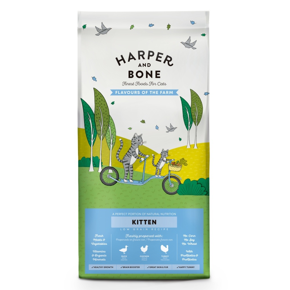 Harper and Bone Cat Kitten příchutě farmy složené pouze z nejkvalitnějších surovin s vysokým podílem masa, přídavkem superpotravin a čerstvé zeleniny, zaručující prospěšné živiny a přirozenou chuť pro dokonale vyváženou výživu.