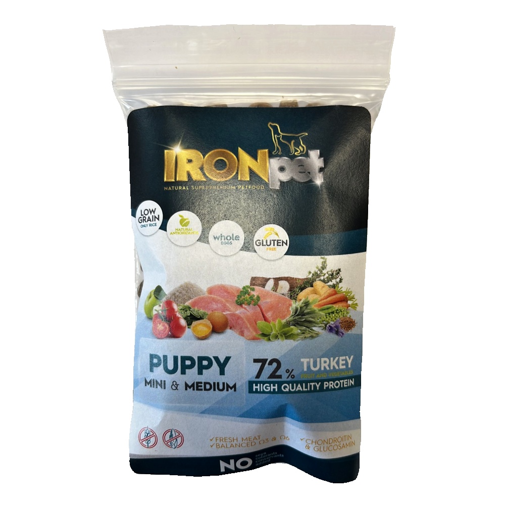 Vzorek IRONpet Dog Puppy Mini & Medium Turkey (Krocan) 70 gSkladem centrální sklad | odešleme do 1-3 prac. dnů13 Kč/ ks12 Kč bez DPH