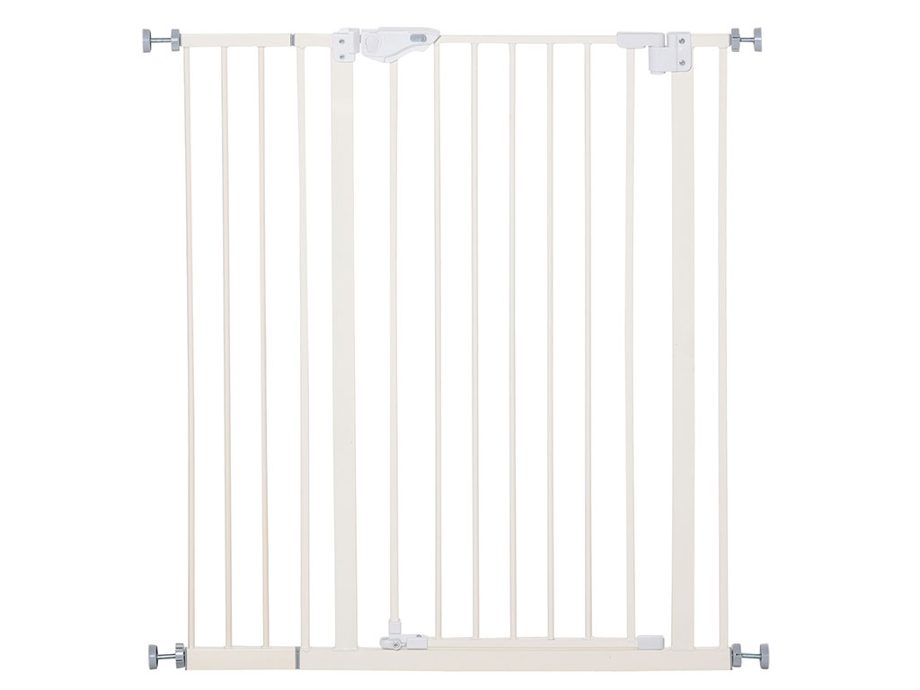 Bezpečnostní zábrana pro psy je vyrobena z robustního ocelového rámu s elegantní bílou povrchovou úpravou, která se snadno hodí do každého interiéru. Závěsy a upevňovací body na stěnu jsou vyrobeny z odolného plastu, což zajišťuje pevnost a dlouhou životnost. Vzdálenost mezi mřížemi zábrany činí 5,7 cm, což je ideální pro zabránění průchodu menších psů a zachování dostatečného větrání. Dveře jsou od rámu vzdáleny 5,5 cm, což umožňuje snadné otevírání a zavírání bez zaseknutí. Pro prostor nad 82 cm doporučujeme použití přídavných nástavců, které zajistí stabilní upevnění zábrany. Celkové rozměry zábrany jsou v rozmezí 74 až 97,5 cm na šířku a 104 cm na výšku, což umožňuje přizpůsobení různým prostorám ve Vašem domě.